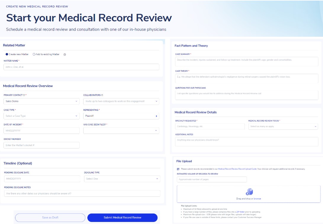 Submit a new Medical Record Review via your Dashboard, the Medical Record Review index page, or an existing matter.