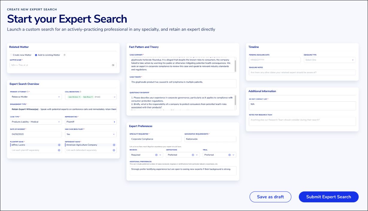 Fill out all fields on the intake form as completely as possible. The more information we have about your Expert Search, the better we can focus our outreach and recruit the best expert for your needs.