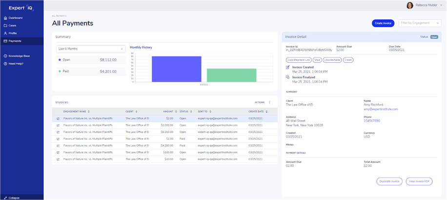 Your Payments dashboard contains a summary of your open and paid invoices across all engagements, customizable within a selected date range.