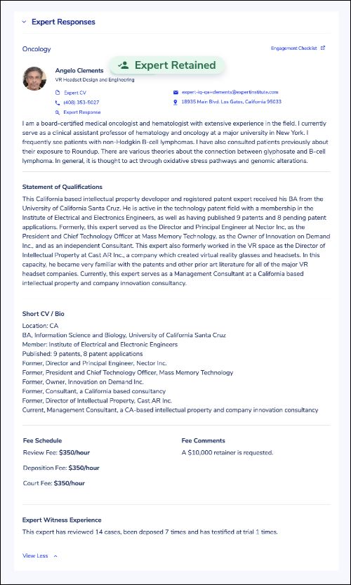 Have you completed your conference calls and are ready to retain an expert? Click Retain Expert to receive the expert’s contact information as well as our Engagement Checklist.