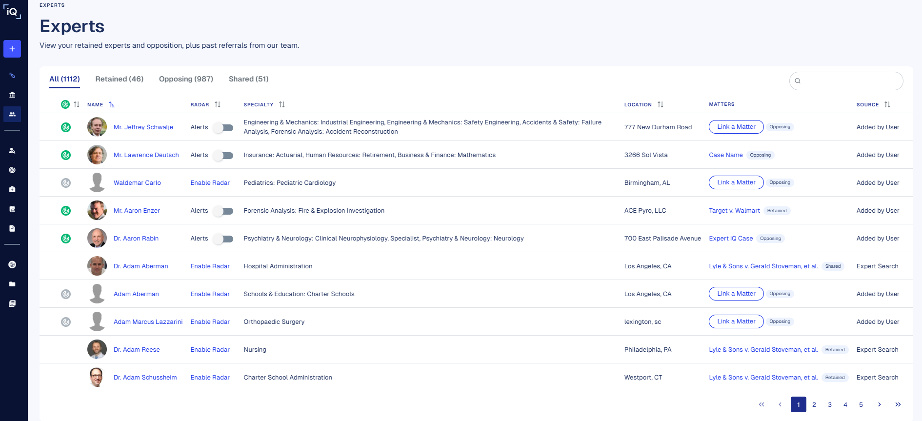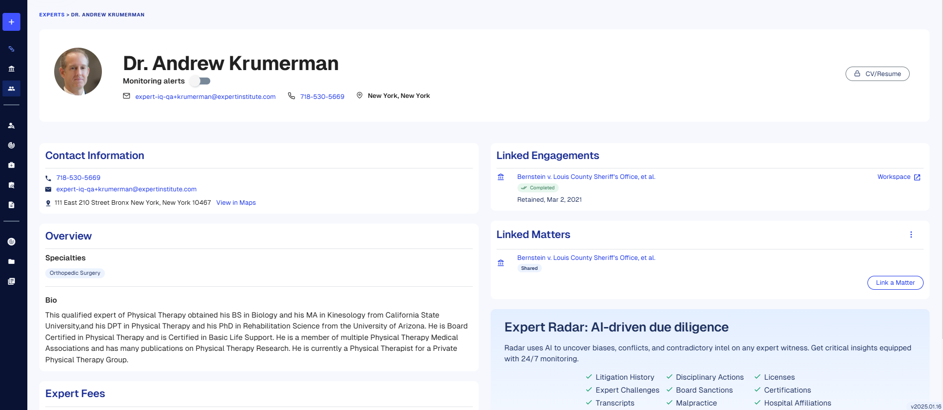 The Experts link in the left menu contains a summary view of all of the expert witnesses Expert Institute has previously shared with you or expert witnesses you have imported.